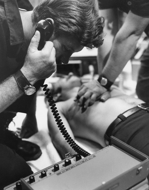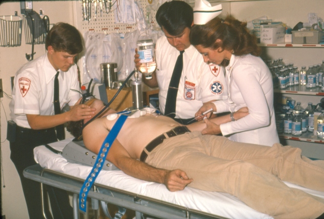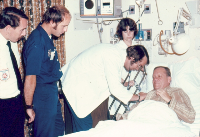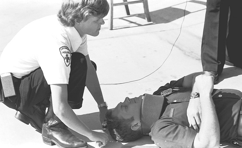 First graduating class Santa Barbara Paramedics, Goleta Valley Community Hospital - 1974 Front row: Kathy Morgan, RN, Jim Ridenour (911 EMS),